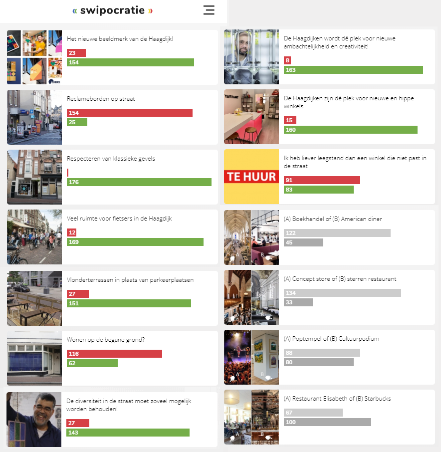 Daarnaast konden jullie van vrijdag 11 tot en met 18 oktober stemmen op swipocratie.haagdijken.nl. Uiteindelijk hebben 176 mensen geswiped! Hieronder vind je de uitslag. Zo te zien worden veel mensen enthousiast van: het nieuwe beeldmerk, klassieke gevels, ruimte voor fietsers en vlonderterrassen. Jullie vinden over het algemeen dat de Haagdijken divers moeten blijven en de plek moet zijn voor nieuwe ambacht, creativiteit en nieuwe, hippe winkels. Voor de kapel zijn duidelijk heel veel opties mogelijk!